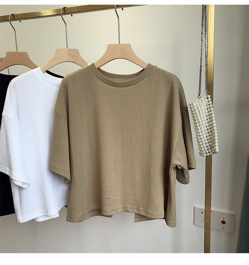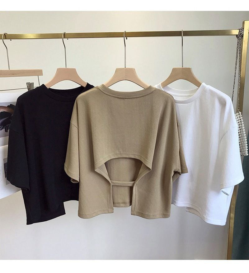 T-shirt court dos nu pour femmes, version coréenne douce et épicée, nouveau style d'été col rond, haut ample à manches courtes pour filles