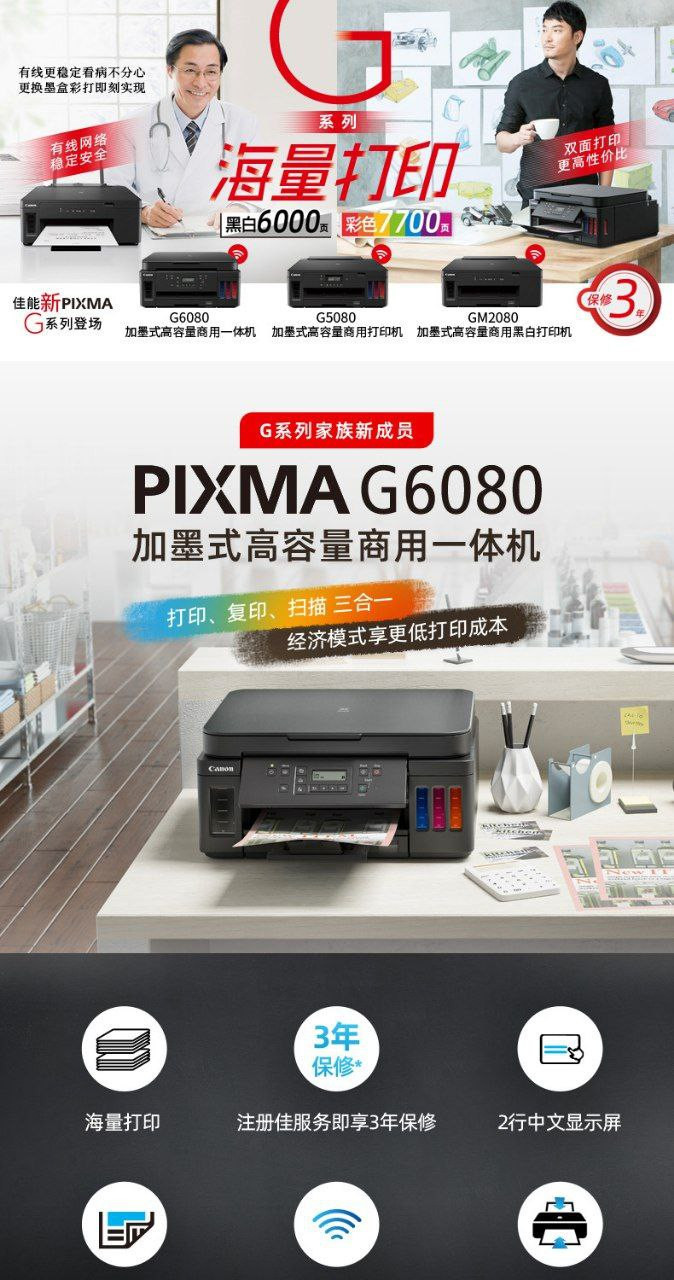 Imprimante/copie/numérisation commerciale tout-en-un à remplissage d'encre continu de grande capacité Canon G6080