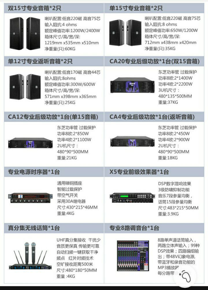 Il comprend plusieurs types d'enceintes professionnelles (double 15 pouces, simple 15 pouces, et enceintes de retour simple 12 pouces), des amplificateurs de puissance (CA20, CA12, CA4), un séquenceur d'alimentation professionnel, un microphone sans fil à vraie diversité, un processeur d'effets professionnel (X5), et une table de mixage professionnelle à 8 canaux.