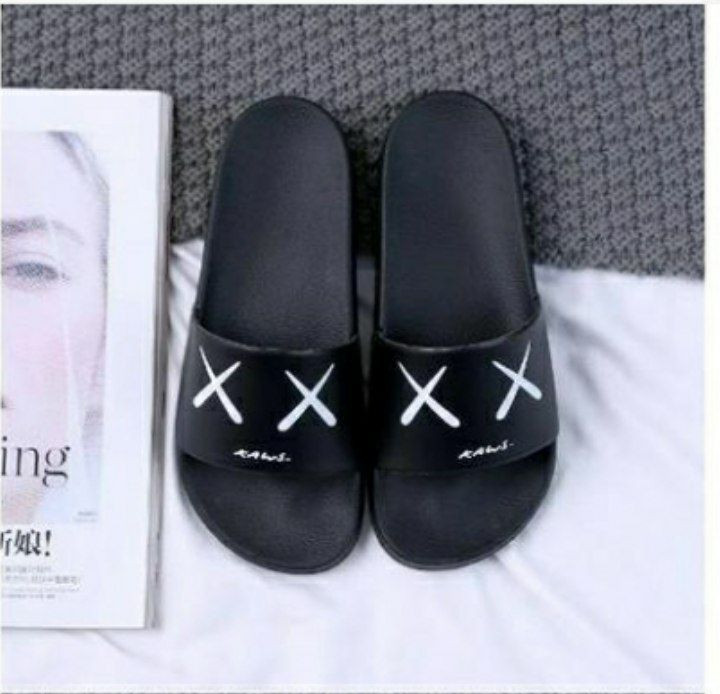 pantoufles Shopee populaires, sandales Kaws de style claquettes, disponibles en noir et blanc avec de différents motif "X.X" ou un motif camouflage/graphique.